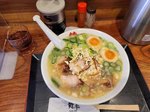 If you want to eat garlic ramen , this is the place to go. Of course, you can choose whether you want garlic or not. I used to like Satsumakko Ramen and used to eat it often, but the price became too expensive and I became a bit distant from it. Then I came across Garlic Ramen Ko-chan near Higashimikuni station and visited there often. The difference between Kochan and Sanpei is that Kochan is recommended if you like mild garlic ramen, and Sanpei is recommended if you want a spicy garlic ramen. The price seems to have been raised a bit from the other menu items, but it is much more reasonable than Satsumakko Ramen. I had lunch there and the price of 1,100 yen for chashu ramen with rice (large portion free of charge) and kimchi is quite reasonable. Topped with a boiled egg 100 yen. I had a large serving of rice and was quite satisfied. I will have a normal serving next time. Also, since other customers had made detailed customizations such as no green onion, no bean sprouts, more green onion, less garlic, more garlic, etc., I had the pleasure of finding the garlic ramen to my liking. Personally, I was a little disappointed that there was a lot of lean chashu pork and not as much tender chashu pork as at Sachikochan in Higashimikuni. I preferred Kochan's chashu. However, it was quite good as garlic ramen, so I would like to stop by when I come to Tsuruhashi. ⚠️One thing to note about is that it is not a very big restaurant, so if you are coming with more than one person, there is a high possibility that you will have to wait for a while. This is my personal opinion, but it seems a little rushed as there are many one-person diners and everyone eats and leaves (good turnover). The waitstaff does not pressure you to leave, so don't worry. Also, there is no parking attached to the restaurant, but there are plenty of coin-operated parking lots nearby. Thanks for...