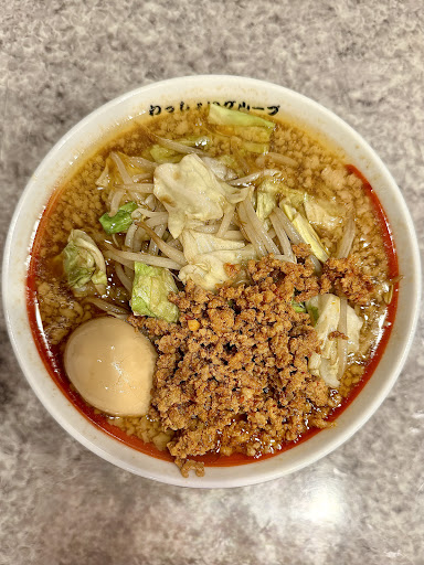 【ビジュアル】 たっぷりの肉味噌にわっしょいグループならではの炒め野菜。スープには背脂がぷかぷかと浮いた、見た目にもガッツリ系の味噌ラーメン。