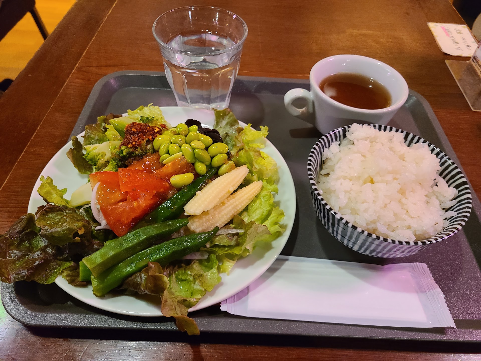 サラダは生野菜からお豆、海藻、ポテトサラダなんかもあって組み合わせ自由 野菜不足なので、モリモリに盛りました。 ドレッシングは4種くらいあって、フライドオニオンとか、蓮根チップ、食べるラー油なんかもありました。 おばんざいも少し、お豆腐も好みでトッピング ご飯、スープも好きなだけ。 お冷やもレモンとミントがあって、全てセルフサービス 食後のお片付けもセルフでした。