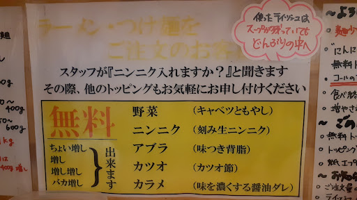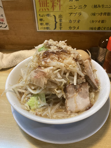 Read more平日の19時40分来店。 食券を買ったから並ぶ、一般的な二郎系のスタイル。 ラーメンは780円からとリーズナブルだが、まぜそばは930円からと少々高めになる。 今回はラーメンの麺少な目(150g)、野菜増し増し、カツオ増しでコール。 すると、二キロ食べられますか?との問いかけが帰ってきた。 少々ビビりながらもYESの返答。 テーブルから見える注意書きには、増した野菜は必ず完食してくださいとの表記。 20分ほどの待ち時間で着席でき、5分ほどで着丼した。