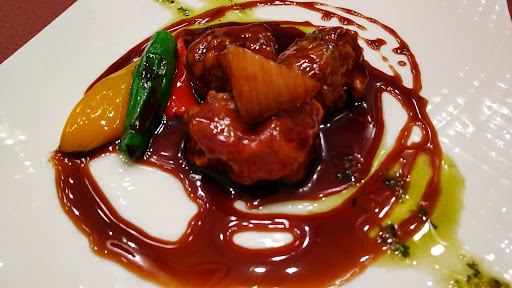 前菜は4種類、さっぱりしてました。 本日のふかひれ入りのスープはとろみがあるので熱々でした。えのきとかも短めにカットされているので食べやすかったです。 牛肉とピーマンの細切り炒めは油っこそうですが、生姜が良いアクセントになっていて食べやすかったです。 海老のチリソースは海老場プリプリしてました、チリソースは結構辛かったです。 豚フィレ肉の黒酢酢豚はしっかりしたお肉が美味しかったです。 蒸し点心3種は翡翠餃子と焼売と肉まんです。 醤油と黒酢で食べましたが、しっかり味がついていたので必要なかったかも。 五目炒飯はあっさりしていました。 チャイニーズデザートは杏仁豆腐でした。 青いガラスの器で見た目が涼しげです。 さっぱりしてました。