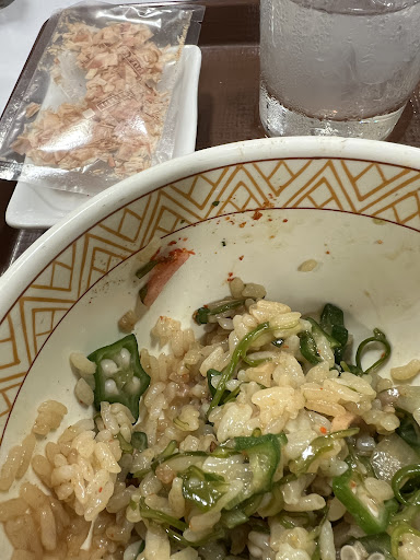 The fact that I paid almost $7 for what I could barely eat makes me sad The picked veggies was wilted lettuce I ordered the rice bowl with the beef, seaweed and okra. Absolutely the worst texture in the world. Idk if it’s suppose to be that way but it was SLIMY. Like you take a bite and the slime drips from the chopstick and from your mouth. It literally felt like it was eating a bowl of snot. The most disgusting thing I’ve ever eaten and it wasn’t even hot… The dishes weren’t clean. The bowl had residue from someone else’s meal. The tray was dirty.