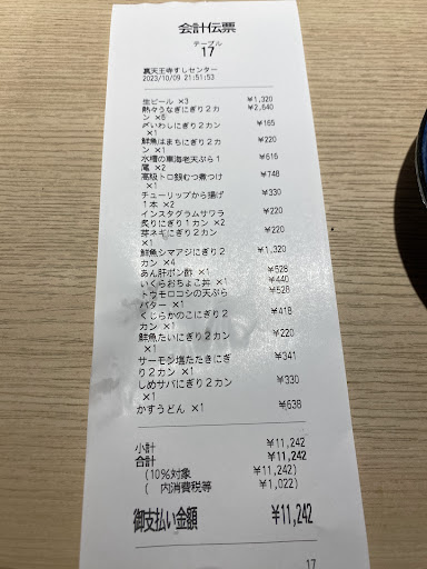 熱々うなぎにぎり (민물장어 소스) 握トロうなぎ白焼き(민물장어 소금) 〆いわしにぎり (정어리) 鮮魚はまちにぎり (방어) 水槽の車海老天ぷら (보리새우 튀김) 高級トロ銀むつ煮つけ (메로 간장 조림) チューリップから揚げ (튤립 카라아게) 鮮魚シマアジにぎり (시마아지) サーモン塩たたきにぎり (연어 소금 타타키) くじらかのこにぎり (고래) 鮮魚たいにぎり (도미) 生カキフライタルタル添え (타르타르 굴 튀김) あん肝ポン酢 (안키모 폰즈) いくらおちょこ丼 (연어알 술잔 덮밮) トウモロコシの天ぷら バター (버터 옥수수 튀김) かすうどん (카스우동) 스시에 네타를 올렸다고 시늉만 하는 저렴한 스시 가게들과 가격은 그다지 별반 차이 없는 살짝 높은 정도의 가격이지만 잘 숙성되어 두껍게 제대로 썰려 나오는 네타를 입에 넣는 순간 고개를 끄덕이게 된다.