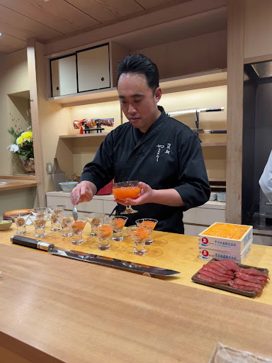 Read moreWir hatten für das Lunch-Omakase reserviert. Beim Betreten des Restaurants steht man direkt vor der offenen Küche, wo die Speisen frisch vor den Augen der Gäste zubereitet werden – ein sehr eindrucksvoller erster Eindruck. Man wird sofort an seinen Platz geführt, direkt an der Theke mit Blick auf das Geschehen. Das Ambiente ist modern und stilvoll, besonders die großen Messer an der Wand verleihen dem Raum eine coole, authentische Note.