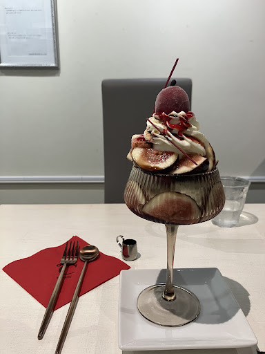 味は全体的に言うと、酸味やスパイスの風味などなど複雑な味が組み合わさった大人なパフェでした。 甘い、おいしいだけの一言では済まされない、こんなパフェなかなか食べられません。 何層にも渡っていろんな味わいがありますが、大きくいうとグラスの上が甘い系で真ん中のラングドシャで分かれて下の方は酸味とスパイスが効いてます。 甘い系の上の部分でいうと、チーズクリームと濃厚ミルクアイスがそれぞれとっても美味しかったです。バルサミコソースが合うの?と思いますが、バルサミコソースで甘さを引き締めて一味違った味わいにしてくれます。無花果と合わせて食べれば上品なスイーツに。 下の部分はもはやピリッとするといった方がいいようなバルサミコソルベとシナモンクランブルで、バルサミコソースを追加でとろりとかけて無花果と合わせて食べればフレンチ的な…ちょっとお食事みたいな食べ応えになります。マスカルポーネムースとヨーグルトクリームで甘さがこっくりします。そこに不思議な風合いのアニス香る赤ワインジュレ…これをパフェに入れるのがすごい。それだけ食べるとなんじゃこりゃーという香りと味なんですが、他のものと混ぜ合わせると不思議と落ち着いてくれてジェルのプルプル...
