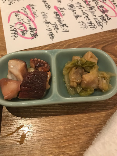 付き出しはタコ頭の酢の物とよく分からない炊きもの。 至って普通。