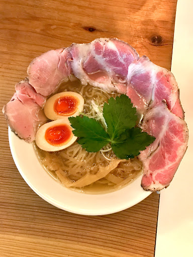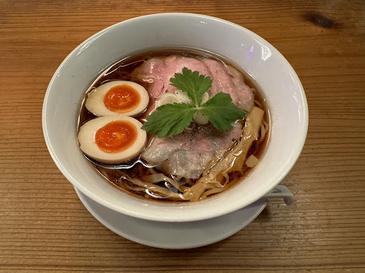 ・味玉中華そば 美しく澄んだスープに綺麗に盛られた麺、メンマ、チャーシューに味玉。 表面は少しオイリーでより美しや✨ スープを一口。 おぉーーーー。。まじで美味すぎる。。 鶏と魚介節かな。 醤油の味も立ってて酸味や苦みなどで複層的な味わいになってますわ。。 麺は、私の好みの全粒粉でモチっと感が◎ 大判のレアチャーシューは、柔らかく少しスープに浸してパクリ。 いや、このチャーシュー美味すぎる。最後に少し炙る事で香りが立ってて贅沢感◎ 味玉の半熟加減は写真の通りで美しすぎて美味し過ぎで文句なし‼️