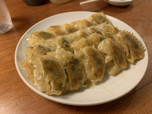 Dumplings with pickled cucumber is served at the counter of this chilled diner & bar.