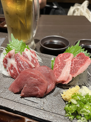 ⚫︎馬刺3種盛 霜降り、ロース、カルビの3種。コースの馬刺しなので若干舐めてましたが、臭み等一切なく非常に美味!