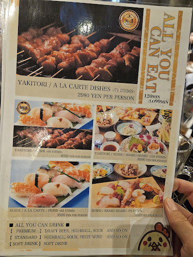 Read moreWe first heard about this place via Instagram influencers. Was quite excited to try out an AYCE place offering so much variety. We made a reservation online SIX WEEKS in advance and was asked to choose what type of AYCE we wanted. ( We chose Shabu Shabu, Sushi, Yakitori for 6000yen). When we got there, we were told that they were out of meat so Shabu Shabu wasn't an option. Huge disappointment as we requested so far in advance to have that as a dining option.