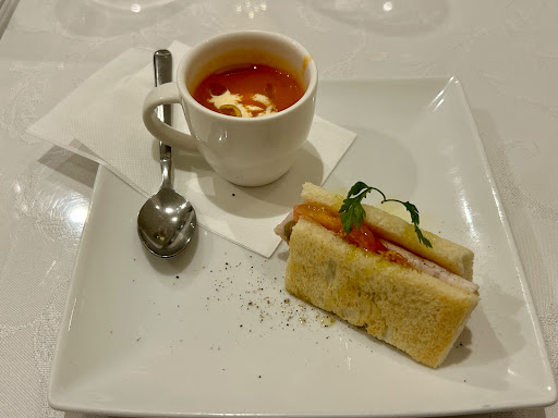 ◯突出し: パプリカスープ, サンドイッチ →パプリカスープは美味しくて体が温まりました。