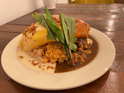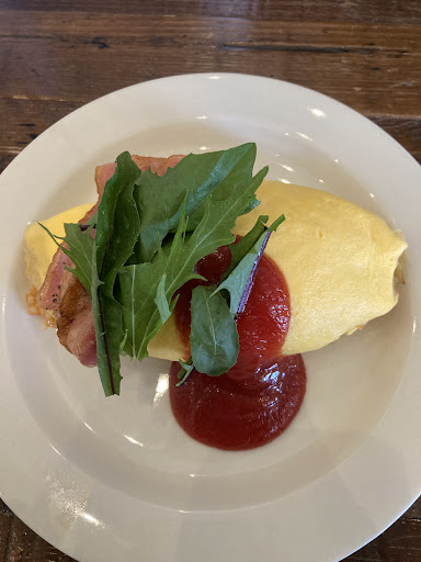 スイーツとオムライスのカフェなので、ランチもディナーも食事はオムライスのみ。 ライスそのものには特に拘った具材を使ってるなどの点はなく、むしろシンプルなケチャップライス。 そして大盛にしなければ本来卵に包まれてる筈のオムライスですが、大盛にするとオンザエッグバージョンに。ドドーンと3.5個使用の卵がふわふわトロトロ♪そこにチーズIN。これは間違いないやつ♪卵パッカーンも出来ますよ(笑) ライスに具がない代わりに、卵の上に2枚のベーコンと葉物が乗ってます。 Wソースは、デミグラスソースとホワイトソースのあいがけ。それぞれのソースの相性も良く、併せても美味い! デミが好きで、外ではデミに拘って食べてきたけどホワイトソースも美味い♪