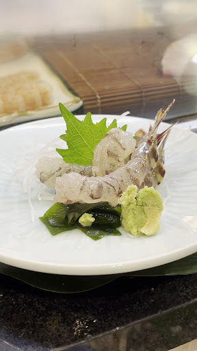 ●車海老造り 提供時に気付きましたがまさかの活車海老。頭は取られていますがまだまだ動いています。活車海老は珍しいのでテンションが上がります。鮮度抜群のブリブリした身を堪能し、しっかり焼かれた頭で香ばしさを味わいました。こちらも贅沢な品。