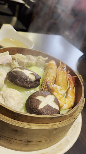 ◼︎地鶏とえびのせいろ蒸し 海老も蒸籠蒸しも大好きなので迷わずオーダー! ごまだれとポン酢が提供されます。