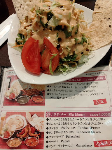 Read moreシラディナーを、いただきました。 カレー2種類とナンを2種類選べます。 エビカレーの辛さ20と、チキンマサラカレーの辛さ15にしました。 サラダのドレッシングにも、スパイスが、入っていて辛くはなくて、風味が、増して美味しくいただきました。 タンドリーチキンとタンドリープラウンが、ついてくるのですが、エビもチキンも香辛料につけて焼かれているので、癖になる味です。 チキンマサラカレーは、チキンや野菜が、入っていて具沢山です。 エビカレーは、濃厚なクリームとバターのコクが、美味しくお腹にずっしりと来ます。 チーズナンとガーリックナンを、チョイスしました。チーズナンは、美味しいので、オススメですが、お腹にずっしりと来ます。 最後に、ラッシーが、優しい甘さで、スパイスの...