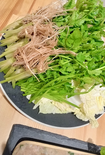 食べ物は鍋と店名に書かれているくらいなので、セリ鍋を注文 味付けは甘くて白菜と牛蒡にセリが人束入ってるくらい そこにつみれと鴨肉ですが一人前1980円 めちゃ高い