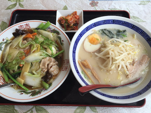 Read moreお昼に入店し野菜炒め定食を注文。 出されてびっくり!すごいボリュームです。 ご飯、野菜炒めの他にラーメン一人前、子供のげんこつ大の唐揚げ2個、サラダまで付いています。 メニュー写真を見た時にラーメンは半ラーメンかなと勝手に油断しており、唐揚げが付いているのも見落としていました。 私は小食でもなく標準的な食欲なのですが、ラーメンは半分以上、唐揚げは1個残してしまいました。 申し訳ありません。 でも正直言ってこのボリュームは、体育会系の学生などなら最後まで美味しく食べられる量でしょう。 味付けは野菜炒め、ラーメン共に大雑把な味付けで深みが足りない印象を受けました。 メニューの種類は豊富で、他のお店でボリュームに不足を感じている人にはおす...