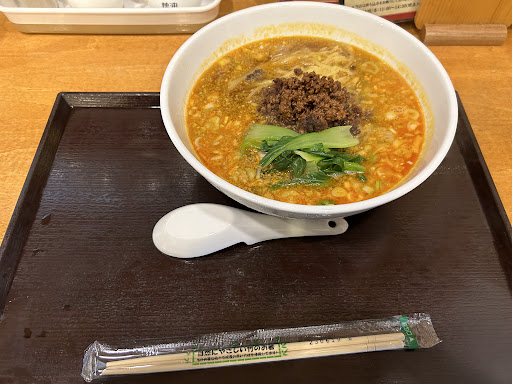 タンタン麺は細麺 スープはサラサラしたタイプで海外の風味もやや感じる。酸味を効かせた辛味、分離した荒い胡麻感、甜麺醤で味付けされた甘い挽肉、柔らかく小振りなチンゲンサイたち。最近よく見る、濃厚なゴマペースト系とは違うベクトルの味。泉にある桃源花の担担麺に近い味わい。好みが分かれるがこのタイプも美味しい。 味に深み、もしくは変化を与えるためか、刻まれたザーサイが入っていたのが印象的でした。この丼の配置はどういうことなんですかね。