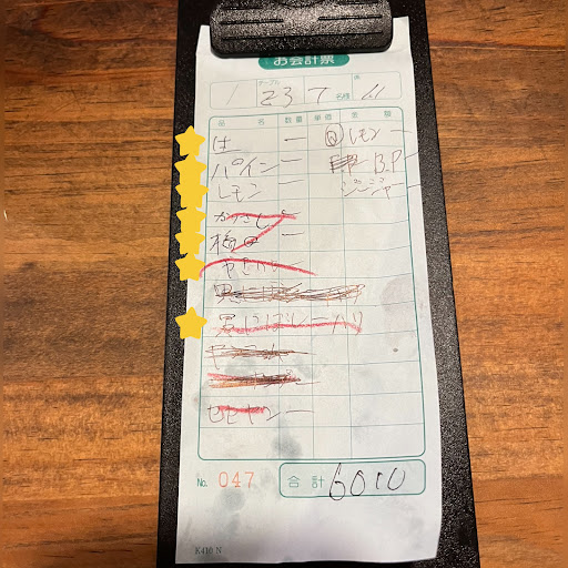 一々頼んだ物を覚えておくのも料金のことを不安になりながら食べ飲みするのもストレスでしかなかったので早めに会計しようと思い伝票を見ると明らかに頼んでない物が多数。笑 ⭐️マーク以外は身に覚えなし。笑