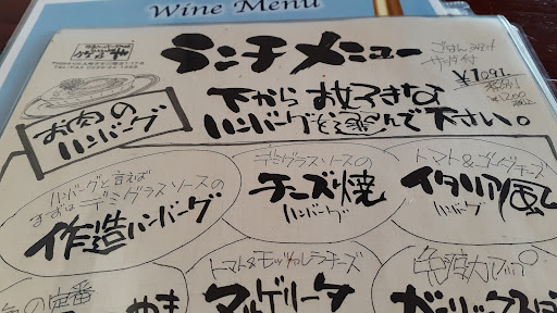 店内はログハウス調で、とても温かみのある空間でした。 手書きでおしゃれなフォントで書かれたハンバーグメニューは どれも美味しそうで、迷う迷う(笑)