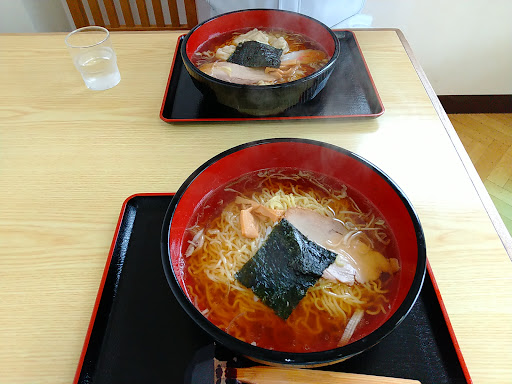 1.5倍盛りを頼むと、5分程度でテーブルへ出して頂きました。 セルフサービスかと思ったので、ちょっと意外。 ラーメンは見た通り、変な彩りとか一切無しの『普通』なラーメン 味は少し薄め、でも麺は細麺でシッカリして美味しいです。 これで500円なのだから、多少笑われても『旨いよっ!!』と言いたくなります。 周囲で食べている人を見たら、味噌ラーメンの方が多かったかな? 次は味噌で太麺にしようかと、同行者の上司と楽しんでしまいました。 なお上司は『おみやげ』の麺も買って、そばが美味しかったと言ってましたね。 次は私も、うどんとそばを買って帰ろ...