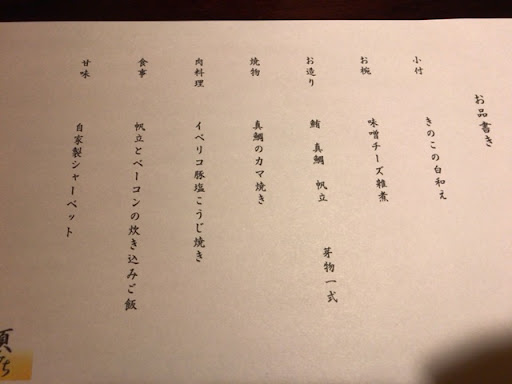 味ですが、先付、お造り、焼物、肉料理、食事、甘味ともまずまずで、皆上品な味付けです。 私としては先付が一番美味しかったと思いますが、どれも手が込んでおり見た目もきれいでした。 どれも素材を吟味しているなと思いましたが、牛のハラミ肉だけはちょっと違ってました。
