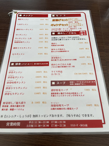 若干の不満点としてはなんだかそっけない説明不足な対応をされた印象があることですかね。 店に入った時点でどうすれば良いのかわかりにくいし、席に案内されるもお冷がセルフサービスだったのに説明されず、注文が決まったら呼んでとも言われなかったから「お冷来たら注文するか」と待ってたらただの放置状態だったのは印象悪かったです。それ以外も全体的になんだかそっけないというか放り投げ気味な感じがありました。 あと凄く細かいことを言うと、餃子(唐揚げ)セットライス付きがあるのに麺と餃子それぞれ単品で頼んでも店員が何も言ってこないでそのまま通される。まぁセットだと餃子が5→3個に減るのでその対応が一概に良いか悪いか、そもそもちゃんとメニューを見てなかった客の問題ではないかと言われるとその通りなのであまり大きな声では言えないのですが…、セットじゃなくて良いのか確認してもらえることが今時当たり前になっていたので、後でセットに気付いた時にちょっと残念な気持ちに。