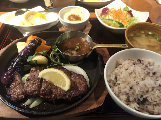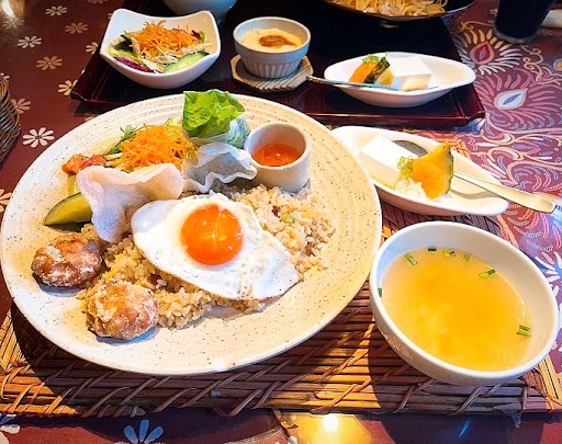 Read moreお洒落な空間で食事をしたいが価格はできるだけ安価に抑えたいという場合に真っ先に名前が上がるのが草木万里野。茶室のような低い潜り戸に東南アジア風の内装と特別感を感じずにはいられない空間となっている。客層は20代から60代の奥様方ばかりで男性客はほぼいない。どこのテーブルでも話に花が咲いていて賑やか、というかかなり五月蝿い。静かに食事したい人には少しキツい。ランチメニューは大きく分けてお肉・スパゲティ・石焼き・チャイニーズ・アジアンとなる。一番のオススメはアジアンディッシュ。スイートチリソースを付けて食べる生春巻きがとても美味しい。次にオススメなのがお肉のランチ。サーロインステーキがとっても柔らかくて美味しかった。ステーキ専門店より美味しいと感じたくらいだ。グラタンとデザートが付いてくるので満足度は高いがその分値段もお高め。今回注文した明太子と高菜の石焼きご飯セット1188円は若干もっさりした味付けでランチメニュ...