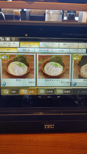 今回は一番頭に出てきた「影丸」を。 太麺って書いてましたが、仕方ない。 5分位で運ばれて来ました。 具は薄いチャーシューに海苔、ネギと背脂。 家系の様な見た目ですね。 スープを一口。。。あら普通。 ちゃんとトンコツの味がします。 激旨って事はないですが、これなら合格かと。