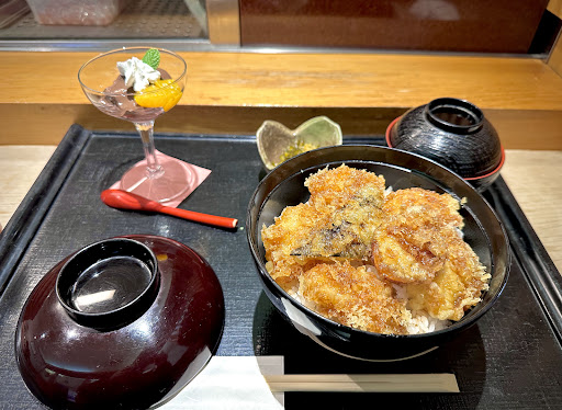 時期が終わるとのことで穴子ではなくフグ天丼ランチを注文、時間はかからず程なくして出てきました。天丼、味噌汁、お新香、胡麻プリンのセットでした。