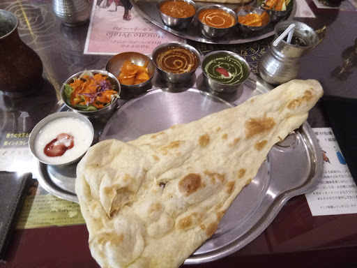 Gigantic upscale Indian place adjusted to Japanese tastes. About 100 seats on the ground floor and more floors upstairs, including special event places. Lots of parking and needed since the location isn't close to the station. Indian music and mixed decorations. Most of the sculpture looks Indian but the paintings are mixed in various styles. Overall effect seems reminiscent of the British Empire days. Wi-Fi was available on request.
