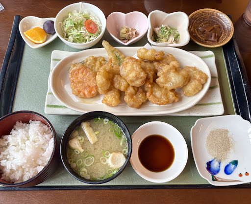 Read more大竹に用事があったので、折角ならランチでもと口コミが良かったこちらの店へ。 駐車場には車が止まっていたので期待して店内に入ると他に一組のみ。 駐車場は他と共有だったらしい。 ランチは1300円〜2000円の価格帯。 魚の気分でなかったので、とり天の定食で。 相方はエビフライ。 メインは見た目のボリュームはあるが、他の小鉢はほんの一口程度、ご飯も少ない。 男性には物足りないと思う。 とり天はカラッと揚げられていたが、とても脂っこく完食がキツかった。細かくて身も少ないので 衣がほとんどだった。 正直、大竹という土地柄からコスパは良くない。 期待していただけに残念。 こちらでは魚を選...