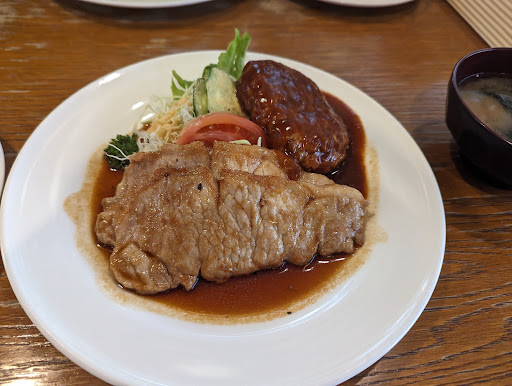 ご飯はランチタイムに訪れたので、ランチセットを注文。 定食の種類がかなりあり迷ったが、生姜焼きとハンバーグのセットにて注文。