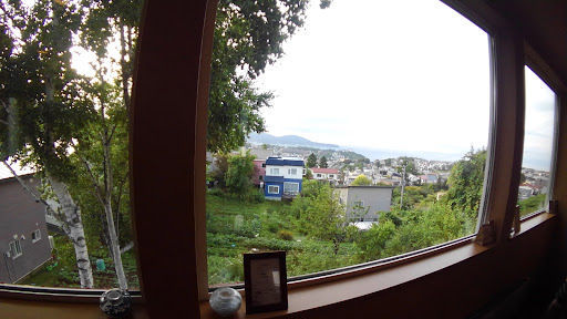 店は二階建てで、入って直ぐ左側が厨房。 右側に二階へと続く階段があり、正面に行くと、一階の食堂です。 食堂の広さは、一階も二階もあまり変わりませんが、二階にはパーティールームの様な部屋があり、それを含めれば二階の方が広いです。 見張らしも当然ながら二階の方が良く、小樽の街と港を見下ろしての食事には二階をおすすめします。 高齢者や身体の不自由な人には、一階は楽で便利でしょう。 お店の裏側の窓が、食堂の窓なのですが、裏側がこんなに見晴らしが良いという事に少し驚きましたね⤴️