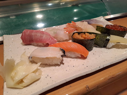 Great sushi at reasonable prices. English menu available. Ordered the drift ice sushi set for 2860 yen. Once ordered, three sushi chefs stated making our set immediately. Ten different sushi in the set. The favourites were the fatty tuna and the scallop. The uni was sweet and the prawn was creamy. The salmon and salmon roe were good specimens. The bottom left sushi next to the salmon was a little hard and bitey. Might be abalone. Not a fan of the yellow hard sushi and not sure what it is. Didn't mind the rest. The complimentary prawn soup was very tasty and not thirsty after at all. Would definitely come back and order more from the menu.