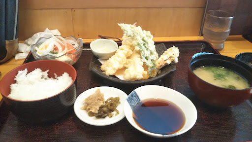2023.12.9 今日は、天ぷら定食をいただきました。 海老2本。あとは、なす、人参等の天ぷら サラダ、お味噌付です。 これで900円は、安い🎵