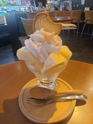 私が行った日はパフェ3種類、メロン、清美、桃の中から選べたので、桃を選択しました。 上に乗ってるハートと星のヤツは、ドライリンゴです。ほんのり甘くておいしかったです。ドライリンゴの下、桃に囲まれているところはいちごのアイスクリームでした。 肝心の桃ですが、果肉はしっかり目でフレッシュな感じでしたが、甘味があまり感じられませんでした。 最下層にはバナナとスポンジが入っていました。バナナは果物店らしい美味しいものでした。 お値段が安価なので、お値段なりかとは思いますが、桃パフェの桃が甘くないとテンション下がります。値段を上げてもらって構わないので甘いのが食べたいです。 店員さんの感じはとても良かったです。お金をあまり掛けず、少し座って一休みしたい場合には良い店かも知れません。