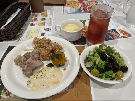 肝心のお料理は大変満足しました。 これと言ってずば抜けた品はありませんでしたが 全部美味しいと思いました。 店内でキチンと調理されてる味でした。 肉類も置いてありよかったです、豚バラ煮込みは軟骨まで食べられて美味でした、唐揚げもありこれも美味しい。 ピザは少しチーズが少なかったです、しかしできたてなのでトロトロチーズ美味しいです。 パスタはなんてことない冷凍と変わりありません。 リゾットは家ではなかなか作れないので新鮮でした。 このバイキング内容で税込み1680円はお値打ちです。 お客さんもけっこう入ってました。 他に食事する施設があまりないので必然的にここに来てるだけかもしれませんが・・・