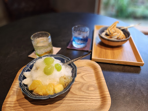 甘夏のかき氷(1000円)を頼みましたが、甘みを抑えた自家製アイスクリームの上に比良山系地下水で作られたという美味しい氷、果物、求肥が添えられて、自然な甘みの甘夏シロップがかけられ絶品でした。求肥もシロップも自家製とのことです。ホットコーヒー(650円。セットで200円引き)はハンドドリップではなさそうでしたが苦みや酸味を抑えた飲みやすいもので、ミルクは生クリームも混ぜられたものでコーヒーと馴染み大変美味しかったです。最初にもらうお水も美しいグラス...