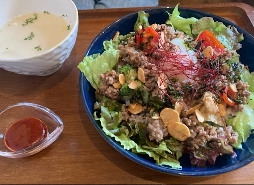 ランチは近江牛とバターチキンのあいがけカレーをチョイス、 カレー2種は上品な味で美味しく、付け合わせの数種の温野菜が家庭的な細やかさがあり、とても美味しく、食べ応えがありました。 友人はターンオーバーに。辛みソースが別添えで良いなと思いました。 タイミングよく14時から注文受付のパンケーキを追加注文出来ましたが、 フワフワできめ細かく、とてもとても美味しかったです。シフォンケーキでもなく、家で焼くパンケーキでもなく、初めての感じでした。美味しかったです! 子供の頃から大好きだったぐりとぐらに、この年になってまた出会えるとは! 嬉しかったです。 接客の方も笑顔でとても素敵でした。駐車場も沢山あり停めやすかった...
