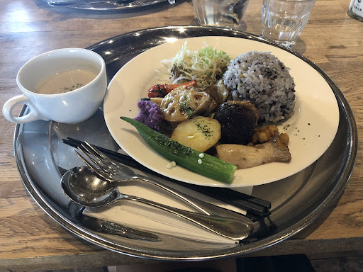 Read more成安造形大学の中のカフェテラスです。 建物からインテリアまで学生さんの手が入っているとのことです。そこかしこに手作りの温かみを感じられます。 メニューはプレートランチが2種類とカレーライスが常設のようです。プレートランチは動物性タンパク質のものと植物性たんぱく質のものと選択できます。プレートのメニューもちょくちょく変わるので、定期的に通えるならば通いたいところ。 カレーライスは野菜が多いですが、スパイスも効いていてとても美味しいです。ライスも十三穀米だったので、食感も良かったです。 併設されているベーカリーのパンも美味しいのですが、密度がかなり高いのでずっしり重たいです。食べ応えあります。ブルーベリーを使ったパンはおススメです。自家栽培のブルーベリーを使っていますので甘みも酸味もしっかりしています。 メインの通りから少し入っているのでわざわざ立ち寄る形にはなるかもしれませんが、行く価値はあると思います。オススメの時期は初夏でしょうか。新緑が琵琶湖に映え...