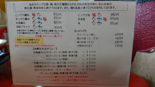 草津から伸びるバイパスから側道に入り閑静な住宅街の中にある個人営業のラーメン屋さん。(ФωФ) 分かりにくいのでGoogleナビは必須かと思われます。駐車場は店舗から100メートルほど手前にあり16~19番の黄色のパイロンがある場所に停めることができます よ(゚∀゚*) メニューはこってりorあっさりの醤油、塩とんこつにあま塩。湖国ブラックもありますので迷うこと必至。 今回は基本に忠実にこってり醤油のBセットを注文。(ФωФ)こちらも御多分に漏れず物価高の影響により値上げしております。特に唐揚げ系は大幅値上げ!(゚Д゚;) ま、致し方ないね。 提供時間は結構早目な感じ。 ラーメンはこってり醤油の名に恥じぬ濃厚な鶏ベースに豚骨のこってり感が足されたパンチのあるタイプ。しかし食べ進めるウチに優しい味に感じるのが不思議である。(ФωФ)麺は加水率低めの縮れ麺。以前は中太のストレート麺だと思うのだが変えられたんだろーか?(ФωФ) チャーシューは肉感がしっかり残る食べ応えのある大判チャーシュー。それが非常に強い『獣感』を引き出している。 チャーハンはしっとりタイプでなかなかラーメンとの相性も悪くない。(ФωФ) 唐揚げはしっかり下味が付いてはいるが付属の塩胡椒でいただくと尚、旨い。 ただ、昼営業が13時30分で終わってしまうので注意が必要です(゚∀゚*) 毎度、来店する度に満足します。 ごちそう...