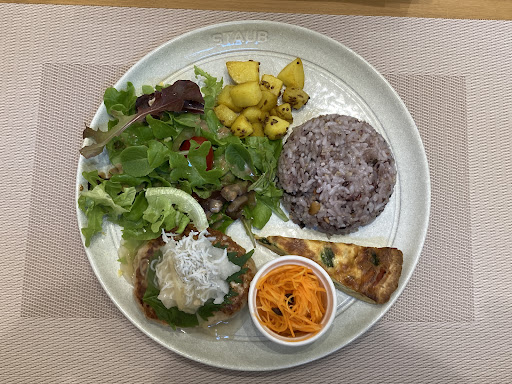 【ランチメニュー(税込)】 ◎ベジ・ポーク(スープ付)(850) ◎ロコモコディッシュ(スープ付)(850) ◎美しくなるカレー(スープ・デザート付)(890) ◎グリーンカレー(ミサイサラダ付)(880) ◎チャリカレー(ラッシー・ミニサラダ付)(880)ほか