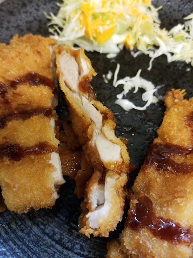 見た目だけ変なのかと思って食べてみましたが、外は硬く中のチキンは薄くて美味しさが感じられませんでした。 箸で半分に割って食べるんですが、お肉が柔らかくて割れるのではなく、硬くて『パキッ』て感じで割れるんです。 ご飯は大盛りでしたけど、ブレンド米みたいで美味しさもありませんでした。 よくこれで人気になるなぁ…と思ってしまいましたよ。