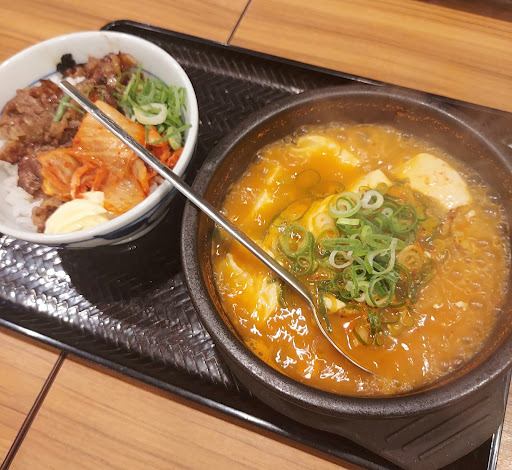 Read more尾張旭市にカルビ丼と純豆腐を推しているお店。 晴丘の交差点のすぐ近くにあります。 看板も大きくとても見やすいのですぐわかります。 駐車場も完備されています。 入り口入ってすぐに券売機があります。 全て食券購入スタイルです。 食券を持って行くとベルが渡されて席で鳴るのを待つ感じです。 なのでサービスは採点は無しです。 今回は和牛すじ純豆腐定食を注文し、生卵をトッピングしました。 辛さや具材を自分で選べます(有料) 初めてなので辛さは普通で券を購入しました。 待つ事10 分ほどでベルがなったので、取りに行きます。 内容は熱々の鍋に入った純豆腐、お新香、ご飯のみでした。 勝手にサラダとかも付くと思っていたので、少し損した気持ちに… 和牛すじの純豆腐は熱々で、具材は春雨?マロニー?、豆腐、アサリ、牛すじ、ネギ、白菜といった感じです。 ネギは上に結構な量盛り付けられていました。 辛さは通常なのでスパイスの味はしますが、全然辛くはありません。 苦手じゃなければ食べられます。 味も美味しくしっかり旨味も出ていて良かったです。 牛丼チェーン店の韓国版...