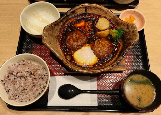 ハンバーグはグツグツ、熱々◎ 熱々でいただけるのはとても嬉しいです☺️ 味も主張が激しくないので濃すぎず食べやすかったです! もう少しボリュームあると嬉しいなあ〜。