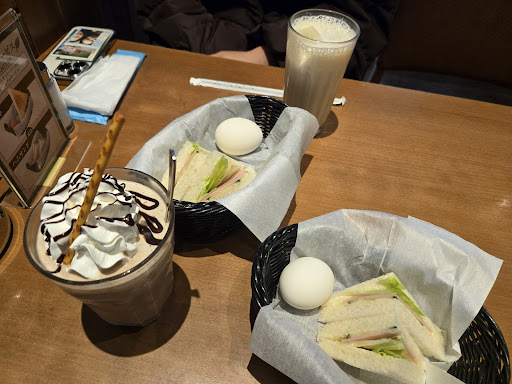 飲み物(なんでも)に無料のゆで卵とトーストorサンドイッチが選べる。 2人ともサンドイッチ🥪 友達はバナナジュース 私はチョコシェイク 外は雪降ってて寒すぎだけど、暖かい飲み物にしよ~って思ってたけど、メニュー見てる内にドリンクの豊富な量でシェイクを見つけてしまった😆 生クリームもたっぷりでボリュームあるシェイクで美味しかった😋
