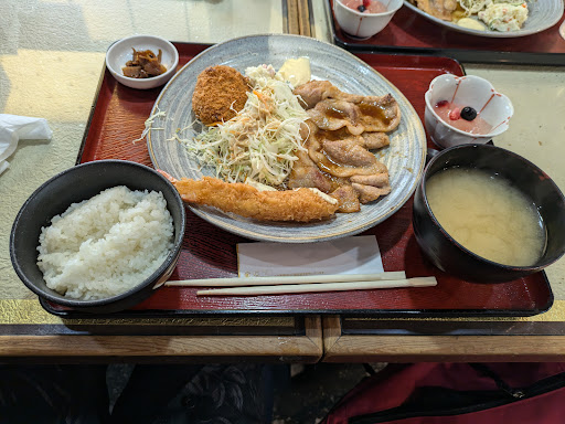 Read more本当は蕎麦を食べに行くつもりだったのが、渋滞が無くて早く着きすぎてしまい別のエリアに移動する事になりました。 同乗の友人が検索して見付けたのが、こちらの店でした。 開店の11時の少し前に到着しましたが、既に駐車場は満車寸前でした。 店内も家族連れが多くてファミレスのような雰囲気でしょうか。 メニューはバラエティーに富んでいて選ぶ楽しみがありますね。 肉も麺類も魚料理の定食もありますけど、栃木に来て魚ってのも場違い感があるので選択に困りました。 どうやら人気メニューは煮込みハンバーグのようですけど…。 結局、コロッケと海老フライと豚肉の生姜焼きのセットをオーダーしました。 ご飯も白米か十八穀米が選べるようですが、敢えて白米にしました。 ちなみに、おかわり自由みたいです。 食事の提供は早いですね。 店名から見ると、米と味噌汁が美味しいのかな?と思ってましたが…味噌汁は良いとしても米は普通ですね。 肝心のおかずですが海老フライは美味でした(^^)。 コロッケは普通ですね。 生姜焼きはイマイチです。 肉は硬いし脂身が多過ぎで噛み切り難いのです。 おまけにタレの味が濃すぎで1枚だけで飽きてしまいました。 身体を動かす仕事の人なら 喜んで食べるのかもそれませんけど…。 しかも、かなり値段が強気ですね。 どう考えても、普通に平日のランチで使えるような価格じゃありません。 2000円オーバーならば、もっとクオリティが良くないと…。 決して美味しくないとは言いませんが、コスパが良いとは言えず、価格に見合...