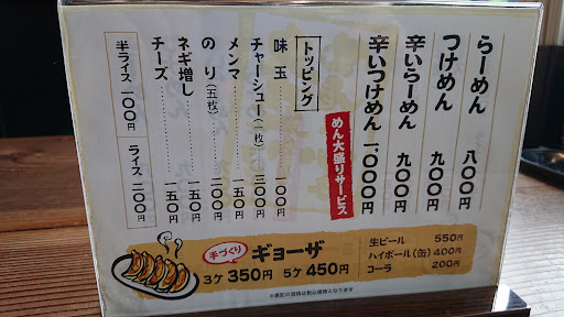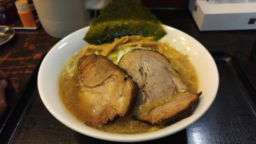 なんの情報も無しに入りました。メニューを見ると、ラーメンと辛いラーメンの二種類にトッピングが何種類かありました。初めてのところでは必ずチャーシュー麺を頼むことにしているので、店員さんに「チャーシュー麺ください」と言うと、「チャーシュー麺というのは無いのですが、ラーメンにチャーシュートッピングでいいですか?」と。細かいこと言うなあと思いながら注文しました。因みに大盛サービスですが、普通にしました。出てきた物を見てテンションが上がりました。どんぶりとどんぶりの端から端まで届きそうな勢いのチャーシューがどんと二枚。しかも5mmは優に越える厚さです。なるほど。チャーシュー麺というものは無く、いわばこの店の「ラーメン」がそもそもチャーシューが主役であり、だからあくまでもトッピングということかと納得しました。メニューを見てラーメン800円、チャーシュートッピング300円(一枚)と書いてあるのを見て、お、強気な価格だなと思っていましたが、それも納得です。チャーシューはよく煮込まれていて、口に頬張ると崩れるようですが、厚さがあるのでほどよい食べごたえです。さらにラーメンのスープと絡み、ジューシーです。今まで食べてきたチャーシューとは一線を画す物でした。麺はもちもちとした佐野系、スープはあっさりの中に複雑な味が絡み合いコクのある醤油スープ。1100円でしたがこれなら高くない。いや安いくらいです。普通盛りでも十分多いと感じました。次は餃子をいただきたいと思い...