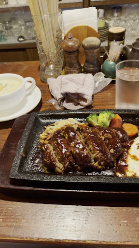 後日、ハンバーグセット。 スープにサラダ、美味しいご飯と 相変わらず完璧なセット。 ? ハンバーグは 柔らかく ハンバーグ好きで良くサインがある 市川紗椰的に言うと? バブル期の伝説のハンバーグ屋 仙台の支倉のハンバーグに似ている。